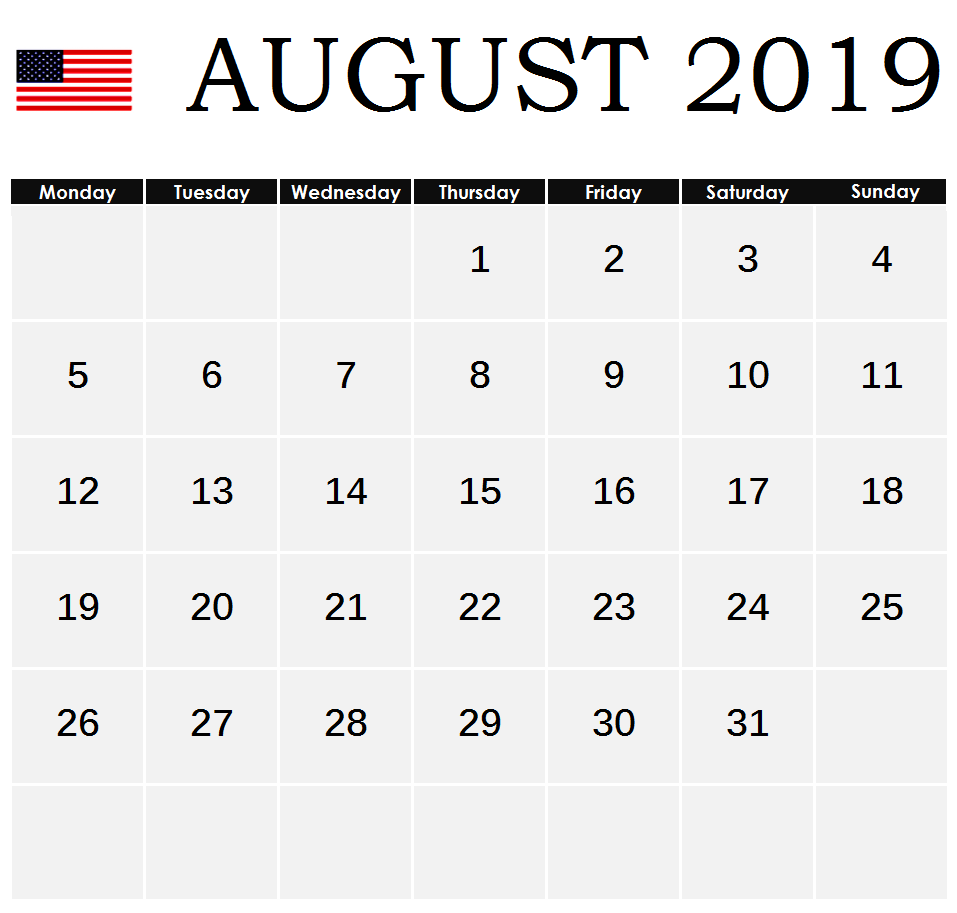 Aug 2019 Calendar With Holidays