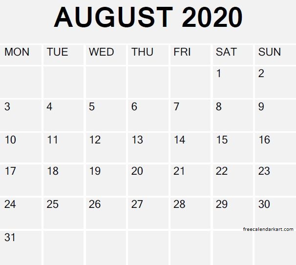 August Calendar Template 2020