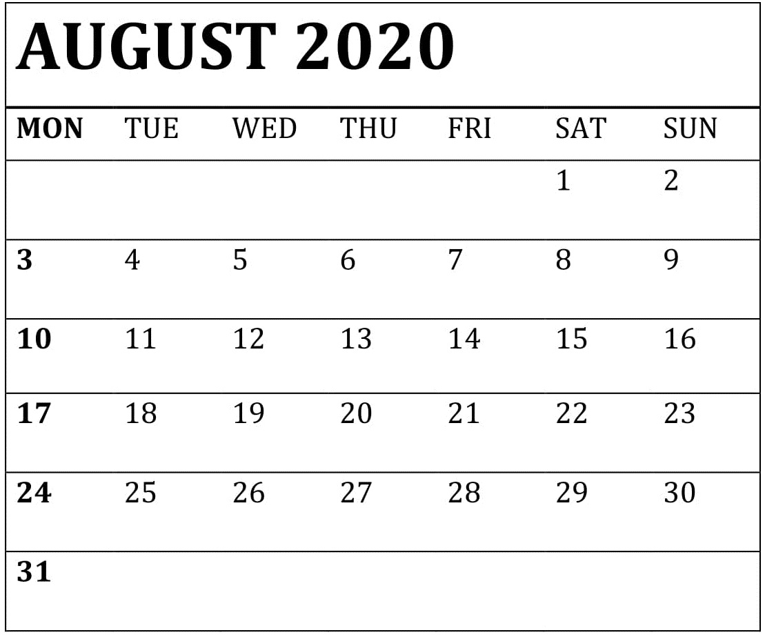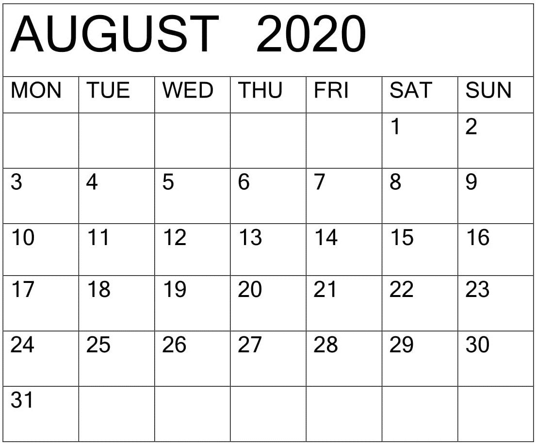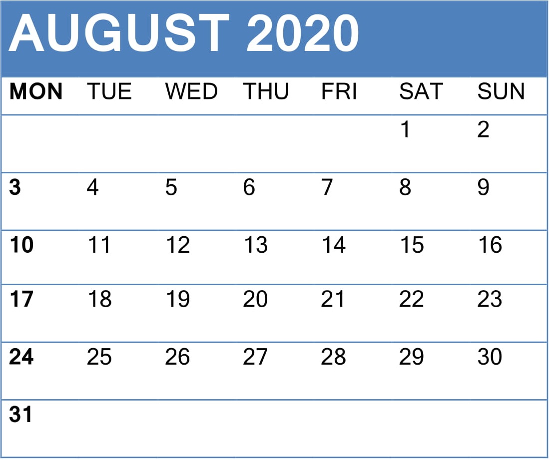 August 2020 Calendar For Editable Worksheet Template