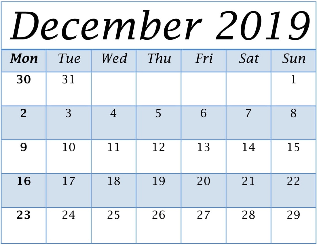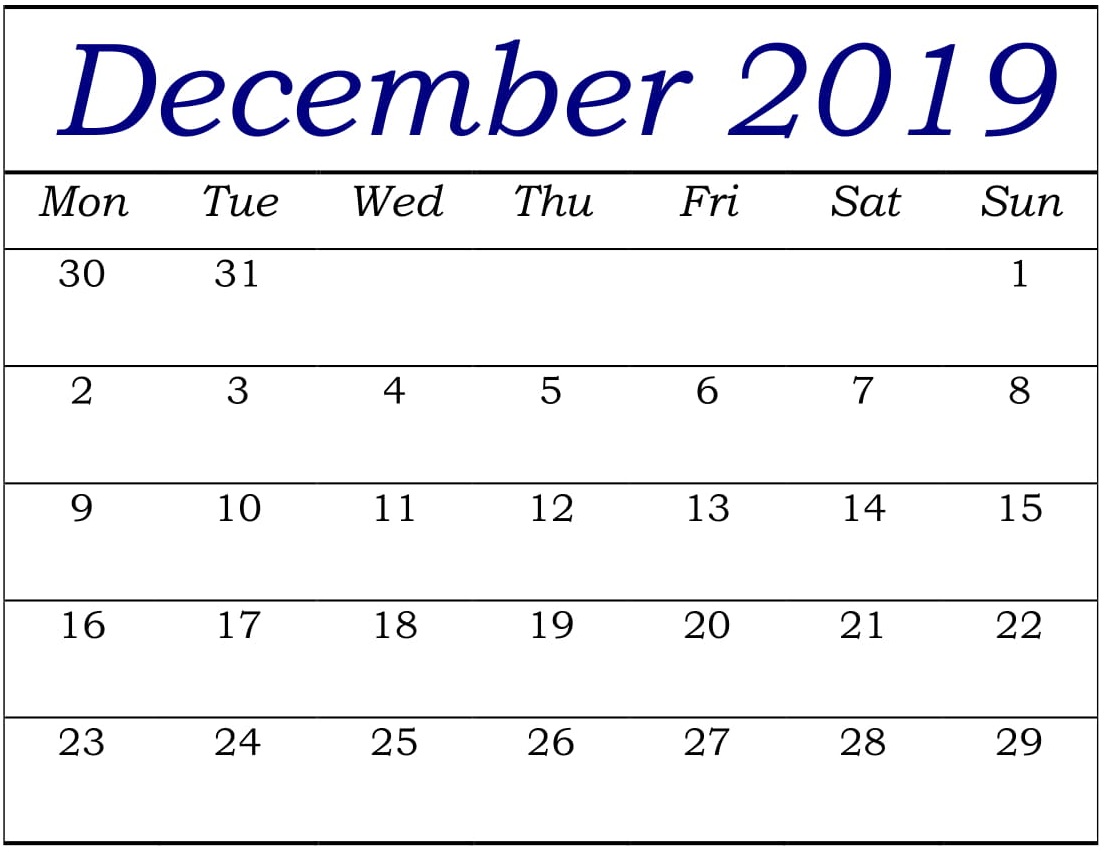 Clarity and working towards goals, increasing work performance, and keeping the work on the project are some of the potential benefits of using a daily planner, calendar, or schedule. A Blank December 2019 Calendar template is the best for organizing the events and appointments. You can have your own personal blank calendar available here. Calendar dates are already filled in the blank calendar template and you can easily write your holidays or events in this document.