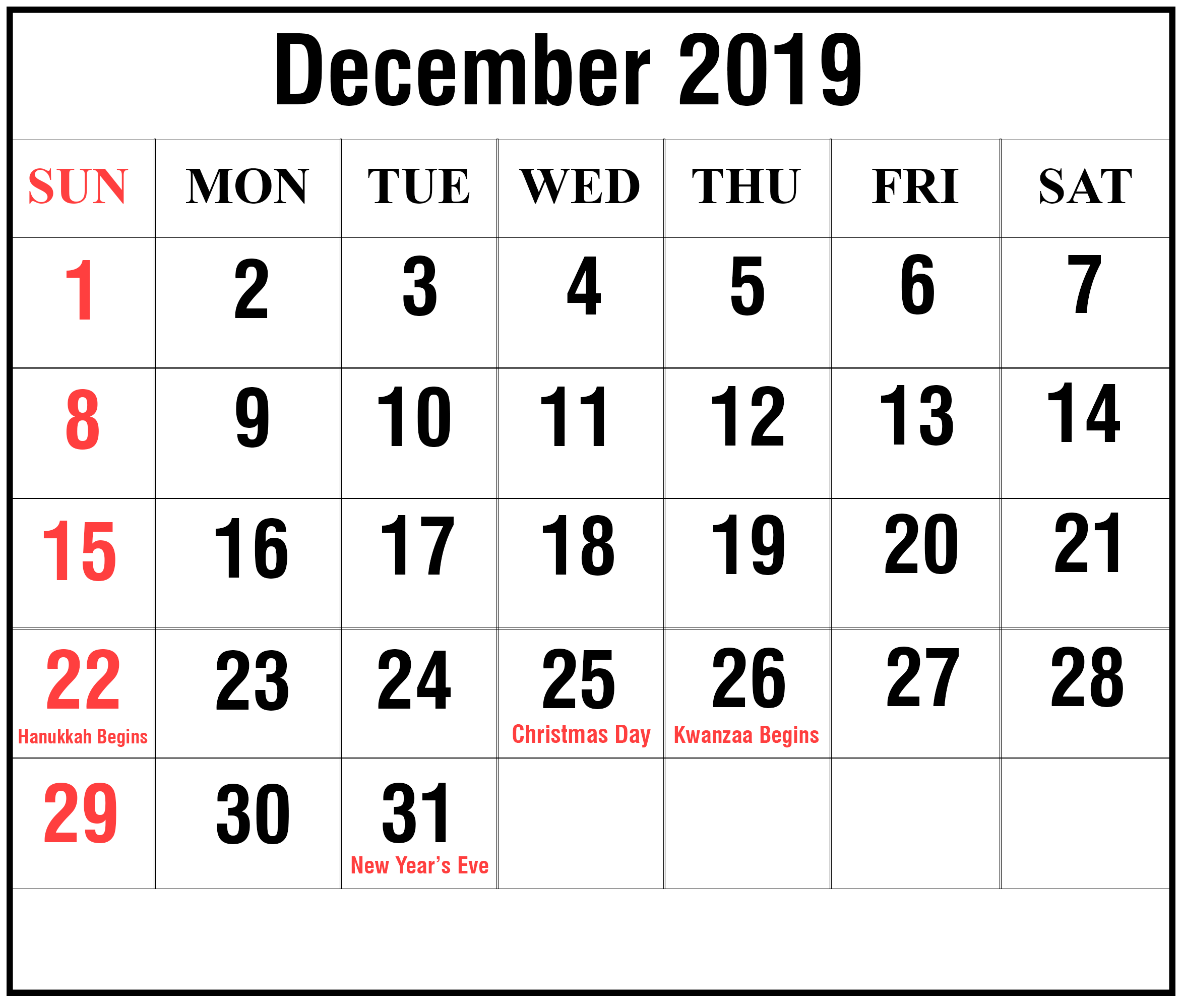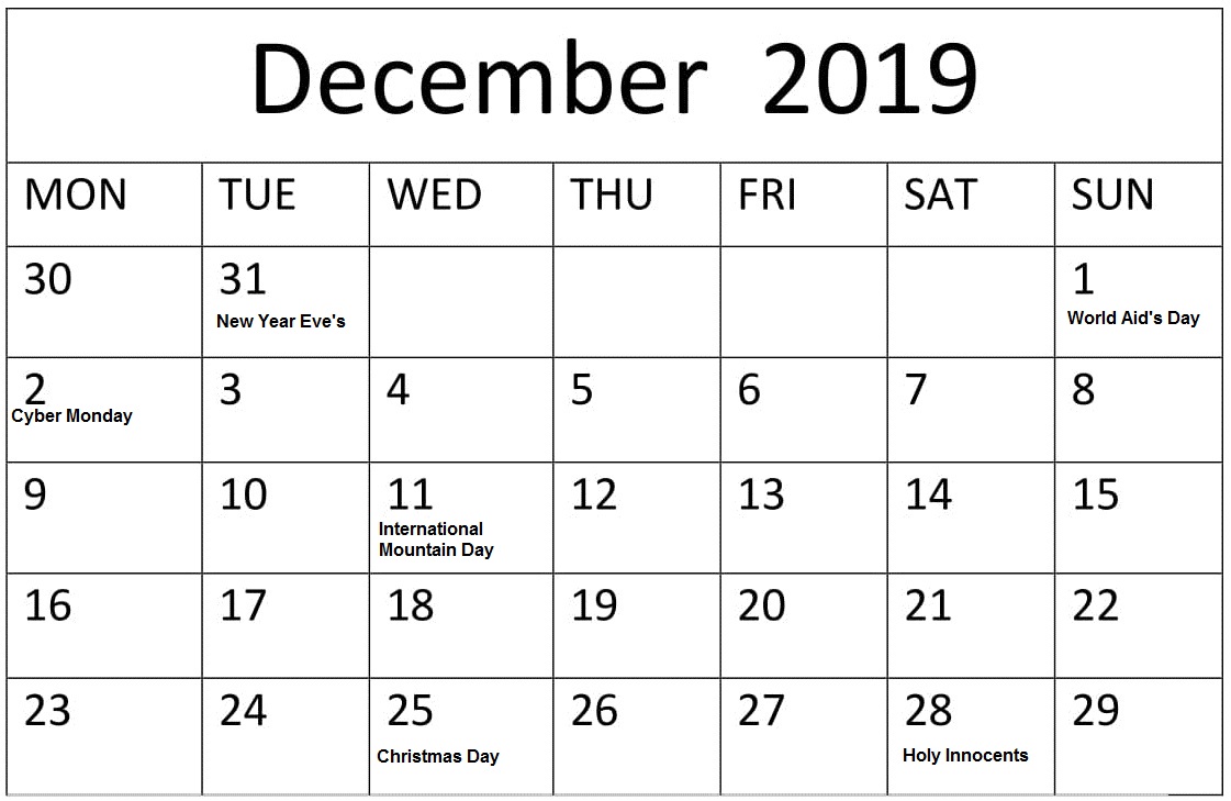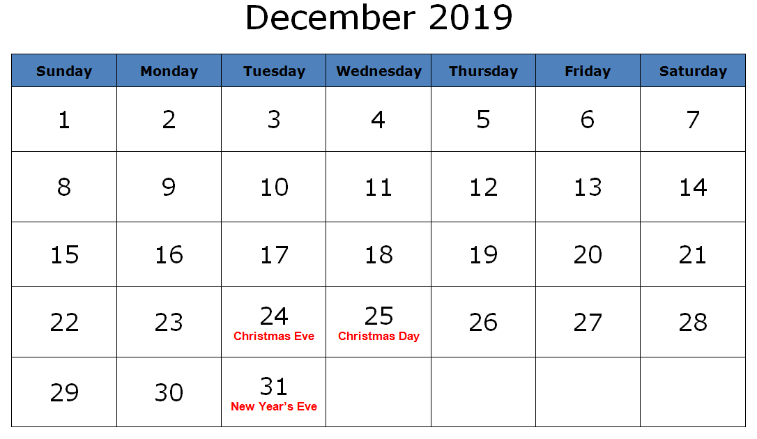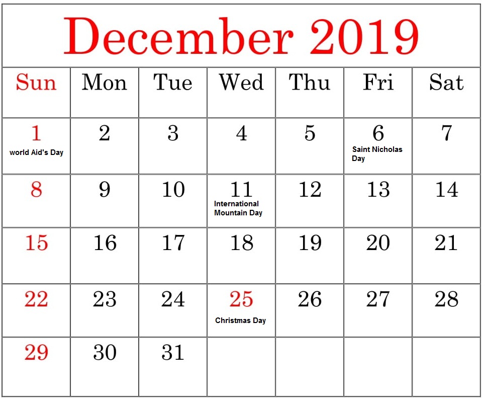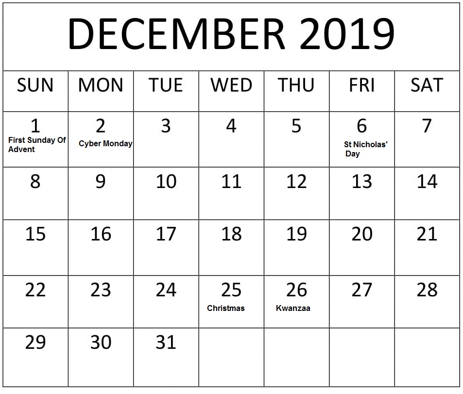 December 2019 Calendar With Holidays