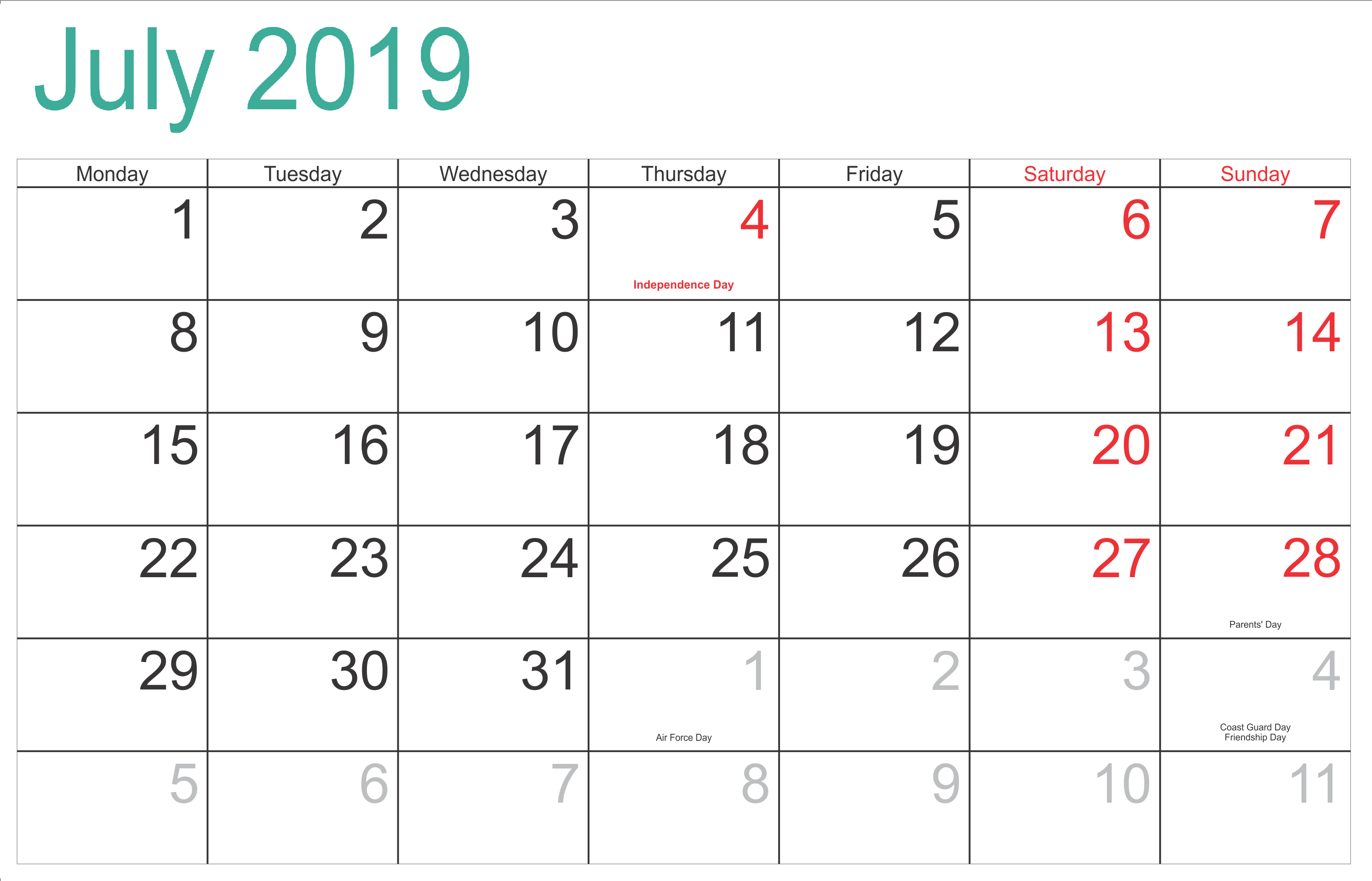 July is often termed as Hay month because all the grass dries because of no rain and can be made into Hay. As July is the compassionate month of Love, Passion and Integrity Ruby is made the birthstone of this month as it signifies Love, affection, and Passion. See More July 2019 Calendar Template