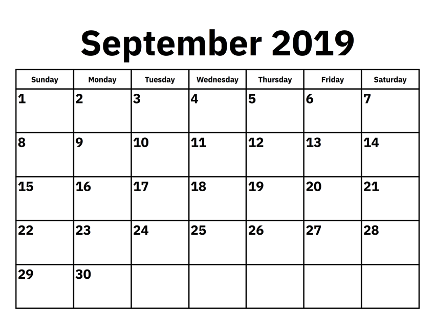 September 2019 Calendar Template PDF, Word, Excel